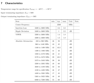 - 通带范围:3400MHz-3600MHz,带宽200MHz